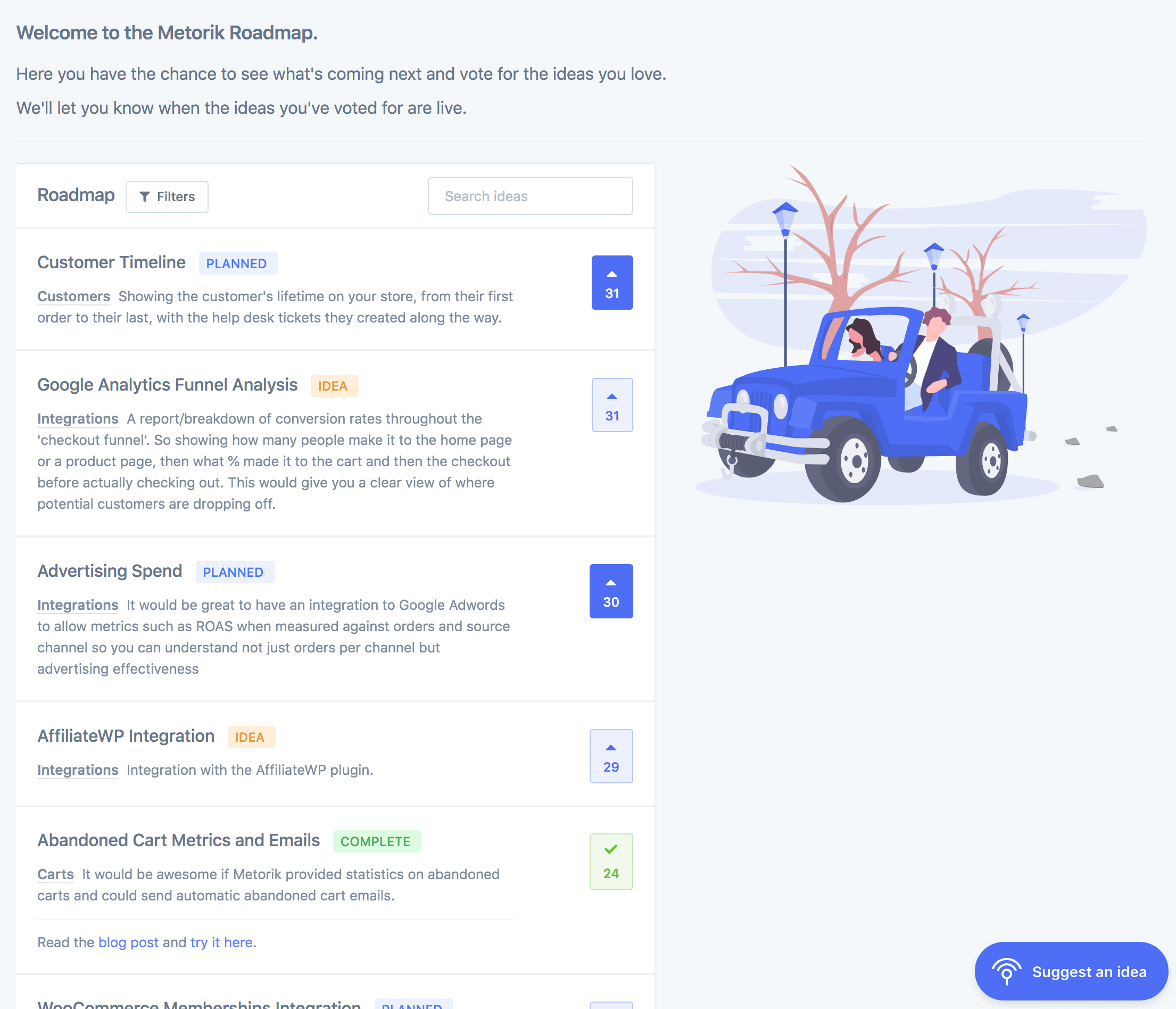 Metorik has always had a public roadmap, where you could view what's coming, make suggestions, and vote for the ideas you love. I've always believed that the key to building a great product is to focus on the customer, so having a roadmap where I could interact directly with customers has always been an obvious decision.