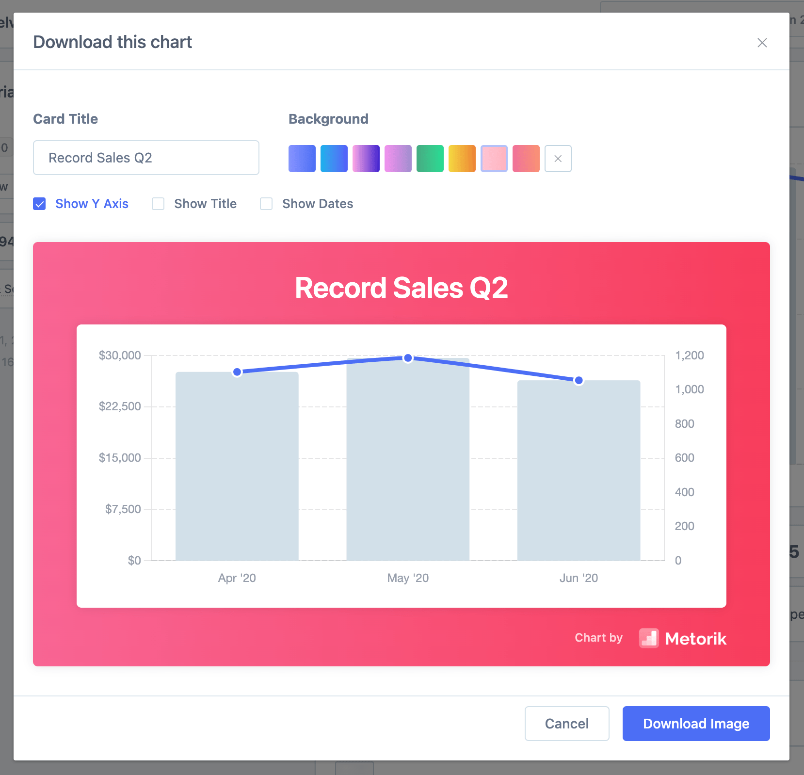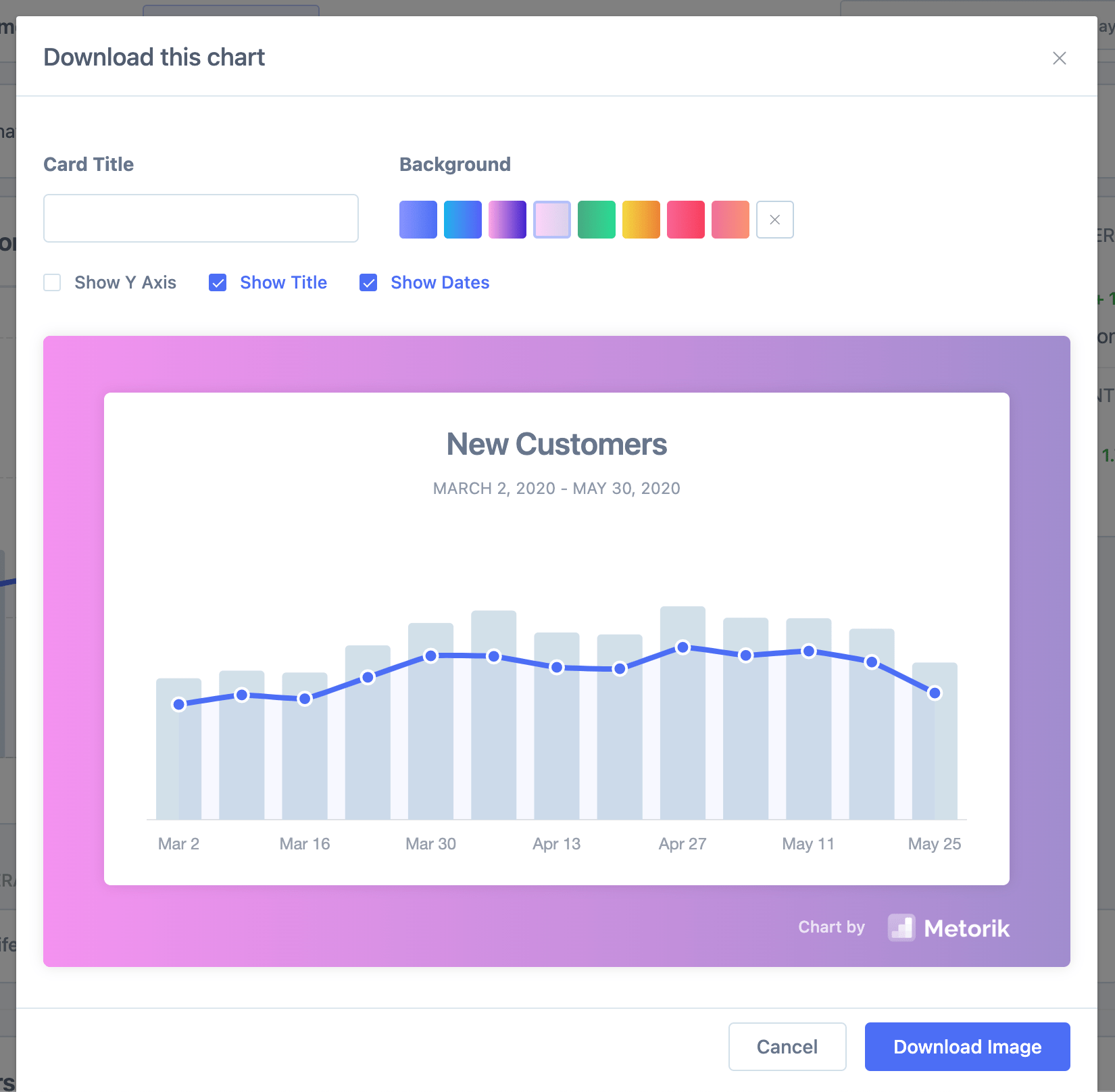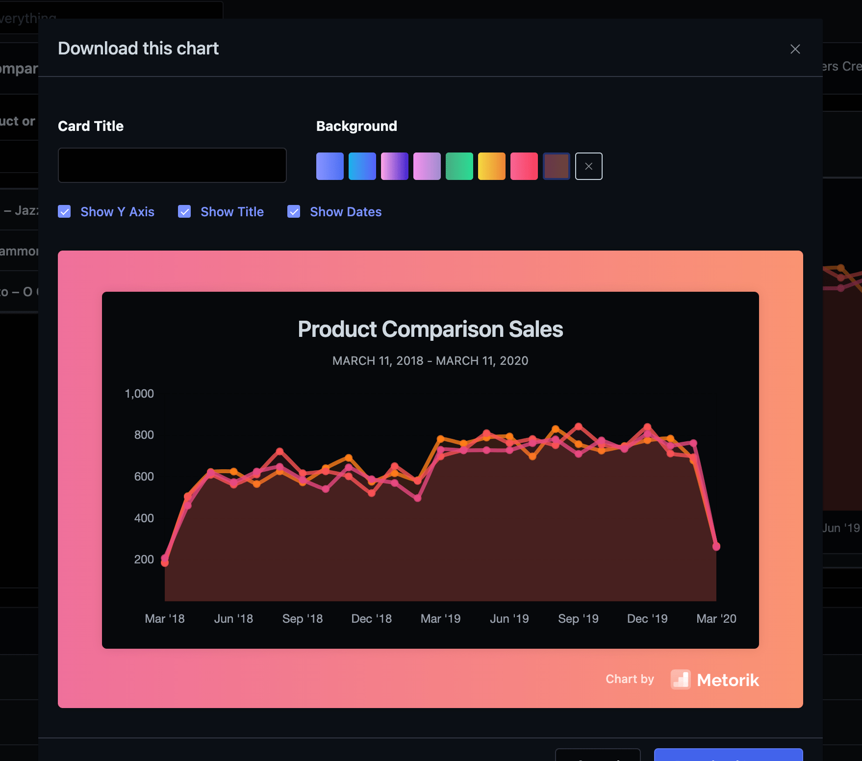 We've just added a simple but truly useful feature - chart downloading. Now on most charts in Metorik, you'll find a download button. Once clicked, a popup will open with the builder for designing the chart: