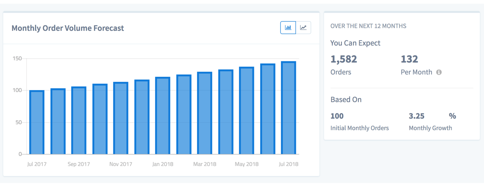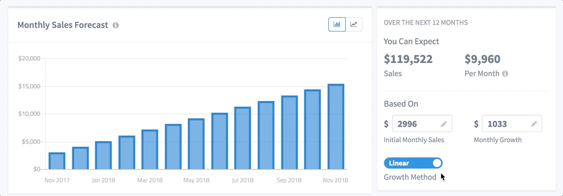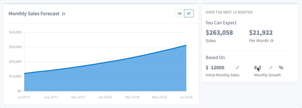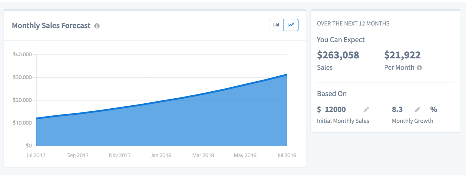 Once you have the growth rate, you'll want to get the most recent's month's sales stats. Using the example above, that would be $12,000. You can then take that $12,000 and exponentially increase it by 8.3% over time to see what your monthly sales would be in a year's time.