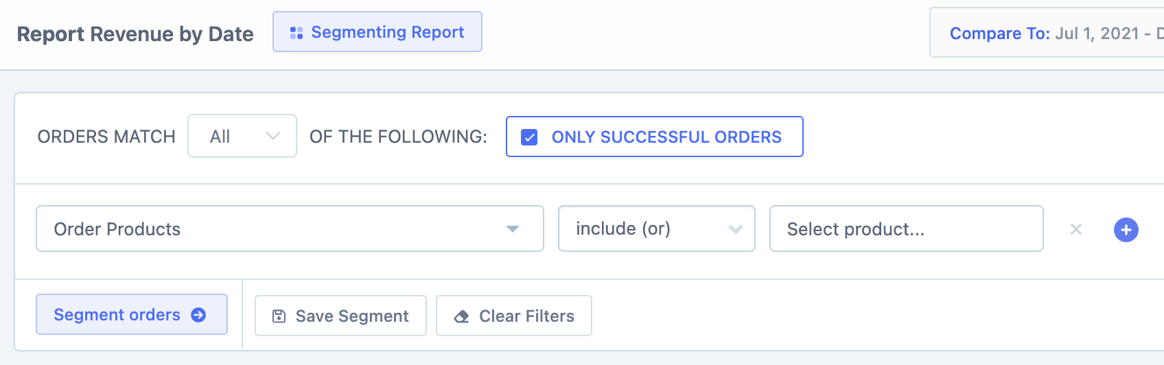 Depending on the type of report, different filters will be available. For the revenue report or profit report, you'll have filters like the products purchased, payment and shipping method used, order total, country, custom fields, and more.