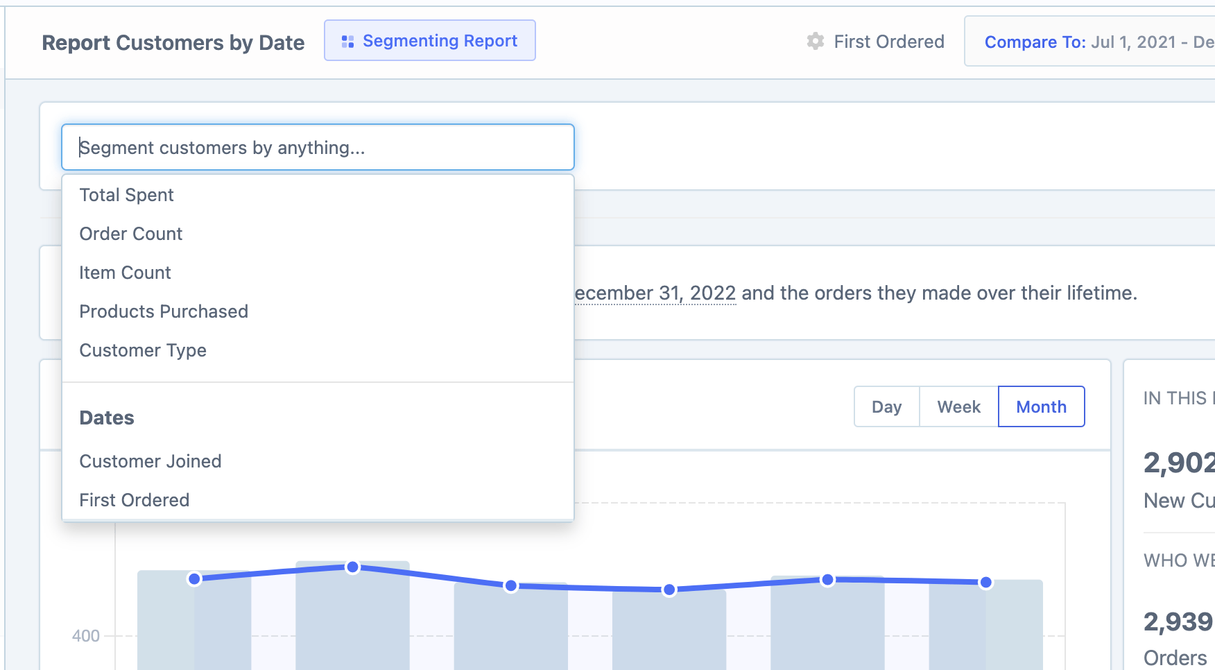 While for the customers report, you'll have customer filters like total spent, last ordered date, customer role, customer location, and more.
