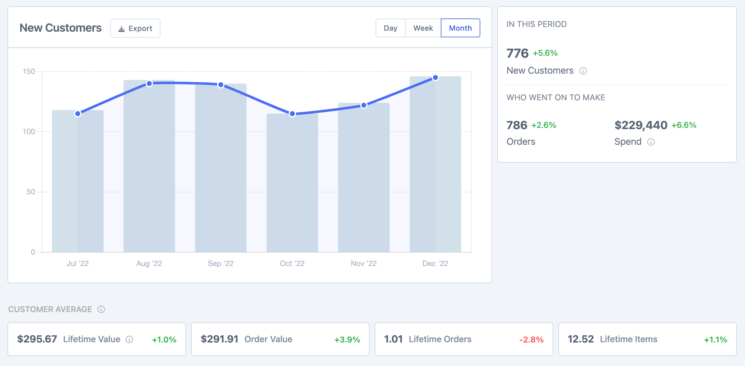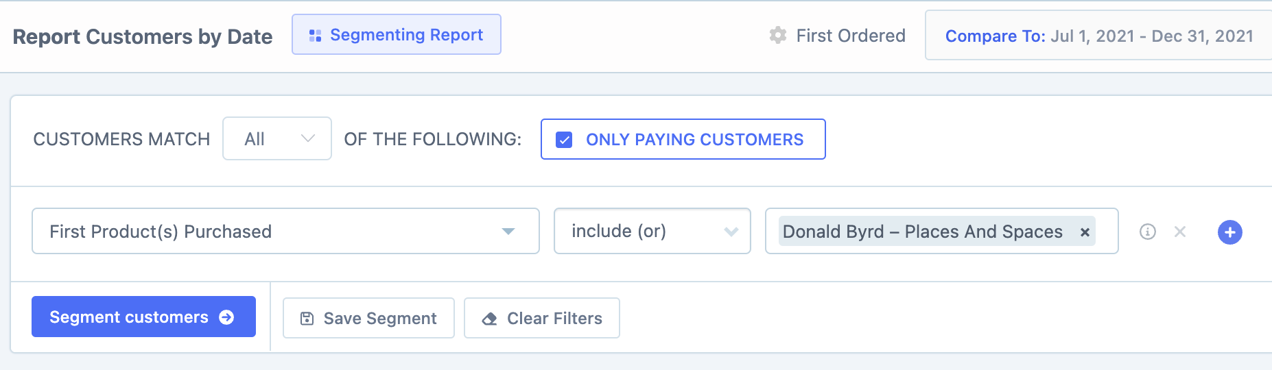 Then the entire customers report would only include customers who first purchased the Donald Byrd - Places and Spaces product. The new customers over time chart, and KPIs like the average lifetime value & orders are now just for that customer segment.