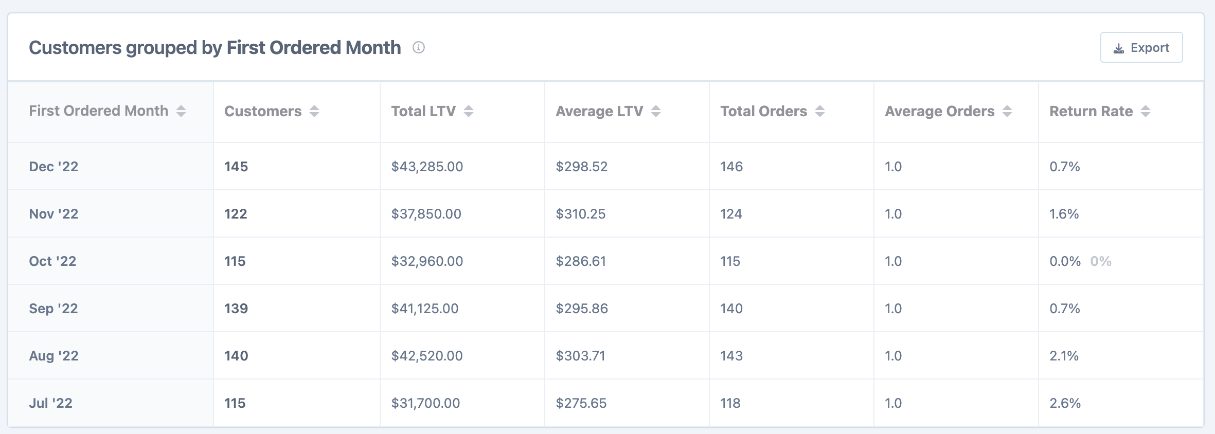 Other parts of the report are also limited, making it easy to see customers grouped by first order month just for customers who first purchased that product.