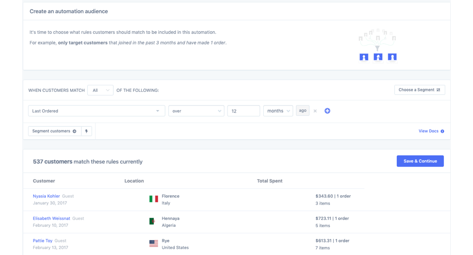 Using Metorik’s powerful segmenting system, we can create a filter to target our specific customer subset. Let’s set a filter so that an email is sent to a customer when they last ordered over 12 months ago. We have 537 customers that currently match the filter. That’s 537 potential new sales: