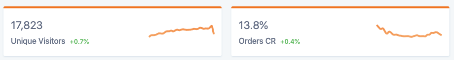 Once it's connected, a whole bunch of useful metrics start appearing around Metorik, combining your unique visitors recorded in Google Analytics with your WooCommerce sales data, determining your conversion rate and its growth/change over time. So for example, you will be greated with these new cards from the dashboard: