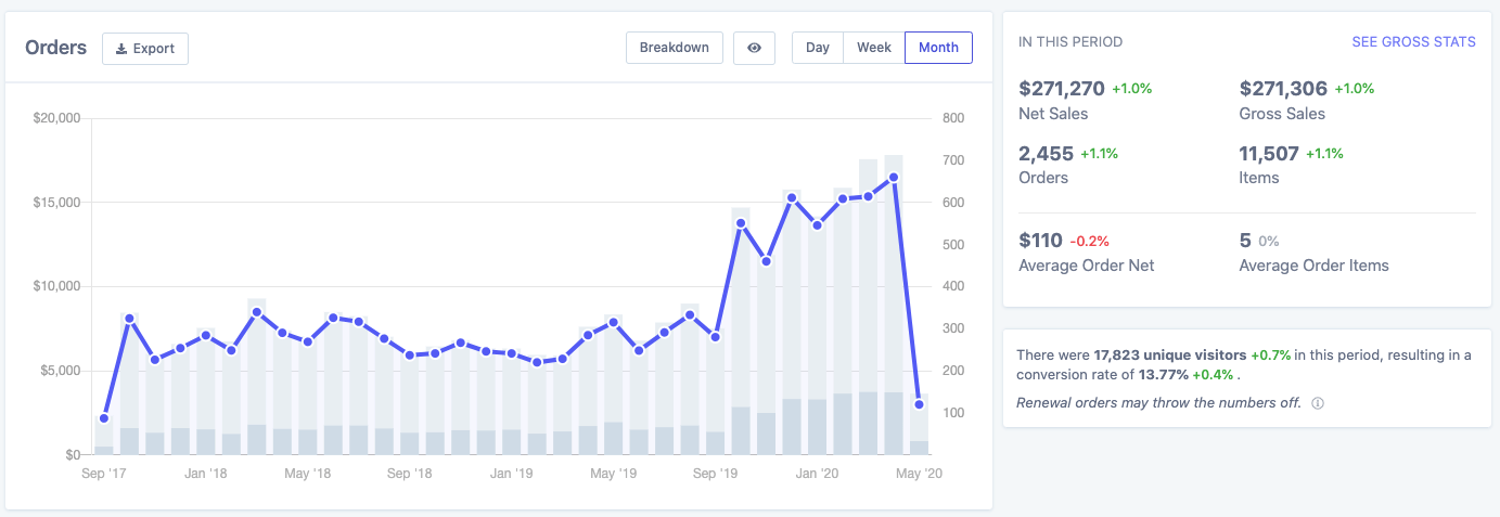 But while it's cool to see how many people are looking at your store, what products get the most views, or where your users are coming from, it's only part of the picture. What is crucial to be able to see is your store's conversion rate; of all the people that come to your store, what % actually end up buying something?