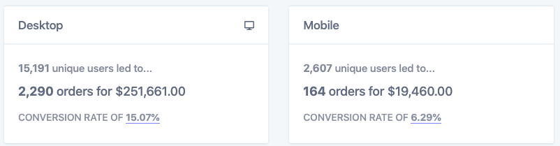 It's possible to conceive that users on a desktop have a higher intent to purchase than someone casually browsing on the phone. However, another possible reason is that your mobile site UX isn't smooth and user friendly enough. In either case, seeing this mobile conversion rate can give you a better idea as to where to allocate your resources. In this case, we should be looking at optimizing mobile, rather than re-designing our desktop site.