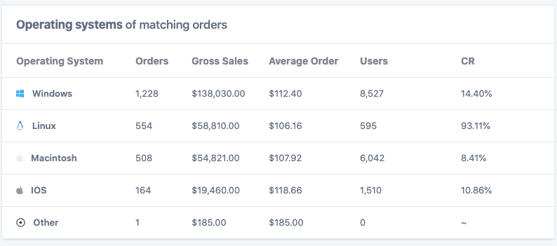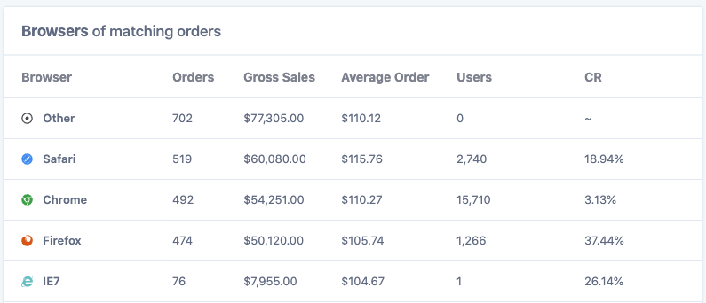 The devices report gives you a breakdown of your orders, gross sales and average order value by type of device, operating system, and broswer. But once you connect your Google Analytics account to Metorik, it also gives a conversion rate per type of device: