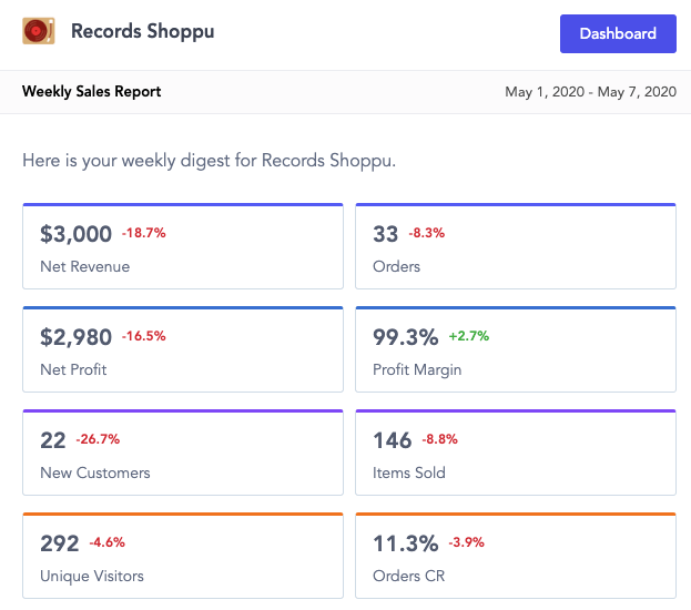 Metorik also has customizable sales reports built right in. So you can create a report that is either sent to your email or Slack, and completely customize which metrics it contains.