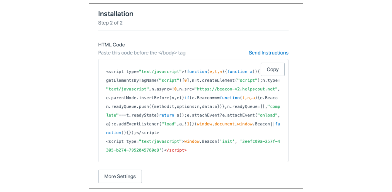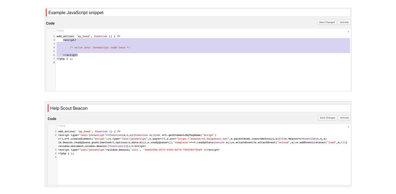 6. Delete the <script></script> tags and paste in the code from Help Scout in their place. You can also change the heading of the snippet to “Help Scout Beacon” while you are here.