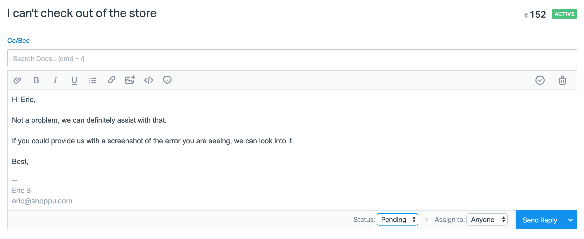 5. We can easily respond to this ticket, assign it a status of open, pending or closed and assign it a member of our team when sending our reply.