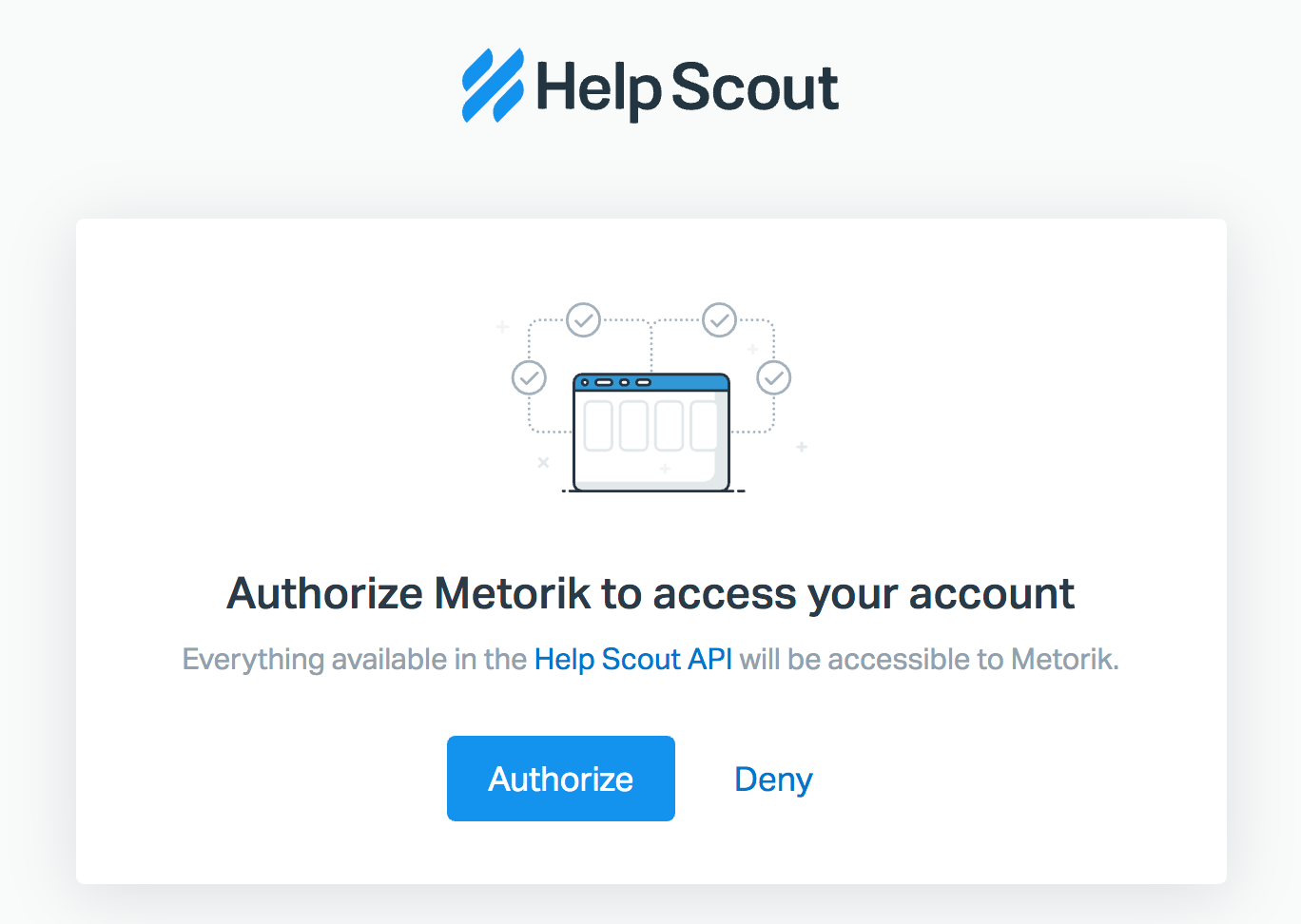 To set this up, go to your Metorik store's integration settings page. Click the Connect button for the Help Scout integration and you'll be sent to Help Scout to authorize Metorik: