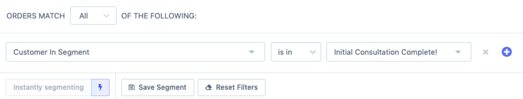 Using this segment on her customers only gives back a list of customers and not specific order information. However, she then can segment her orders using this initial consultation segment: