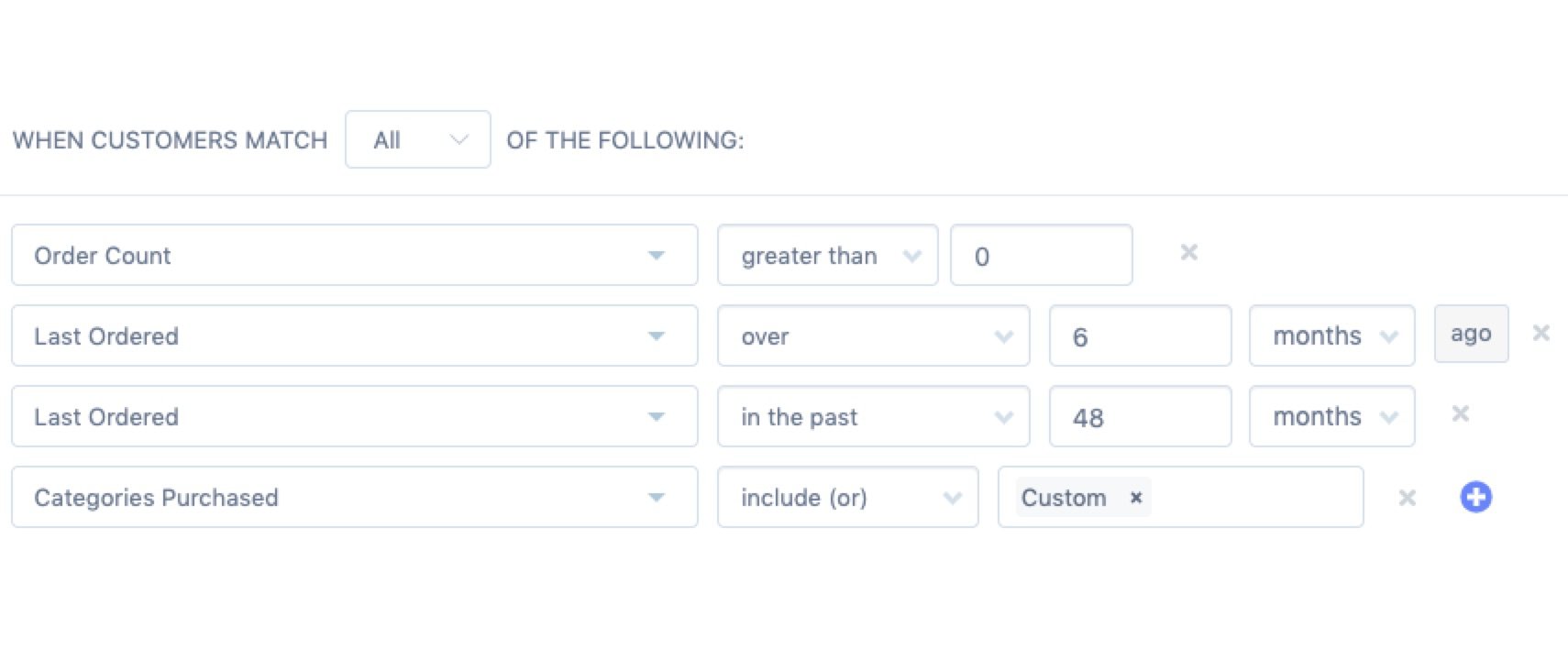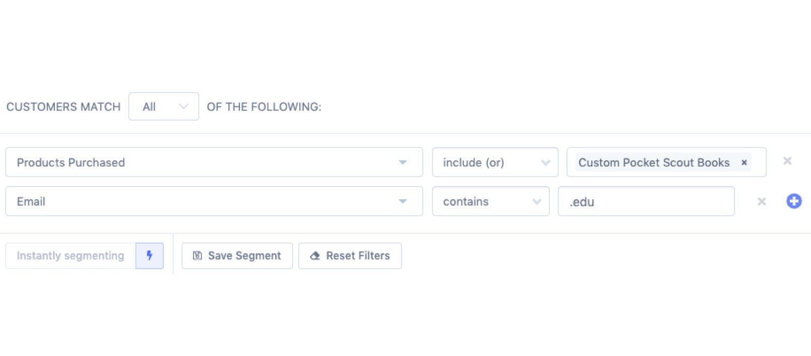"We are looking at what people are adding to their cart or what they have purchased, and engaging with them in different ways.”So for example, they use the following filters to target lost customers that purchased a custom Scout Book: