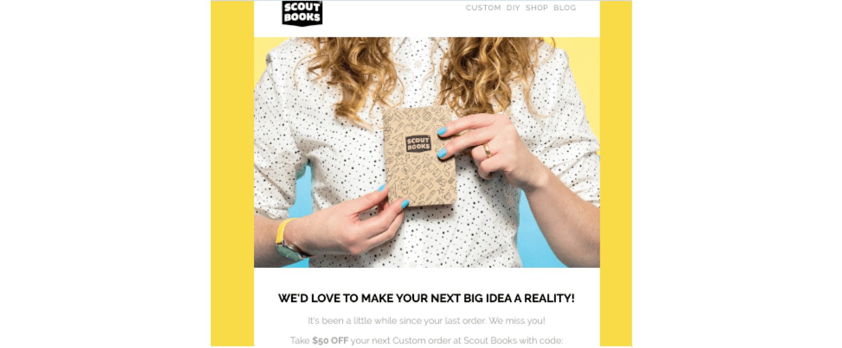 In the past 6 months, Scout Books have started using Engage to target their existing customers and abandoned cart tracking for their potential customers. They have 3 main client bases (retail, custom and DIY) and they have set up different Engage emails that target each of those groups separately: