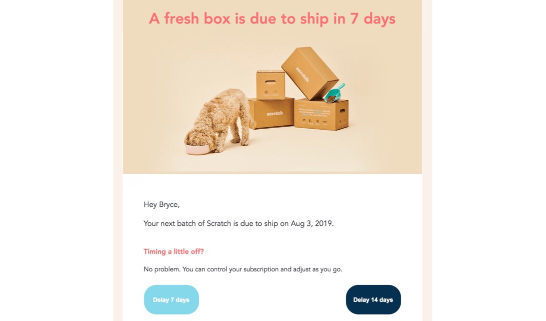 For example, after a customer’s first renewal, they are sent an email automatically saying that they are about to receive another box of Scratch food, an explanation of how it all works, and if desired, an option to easily delay their next order. On their second renewal, the customer doesn’t need the hand-holding anymore, so they automatically stop receiving that email and start receiving a different one.