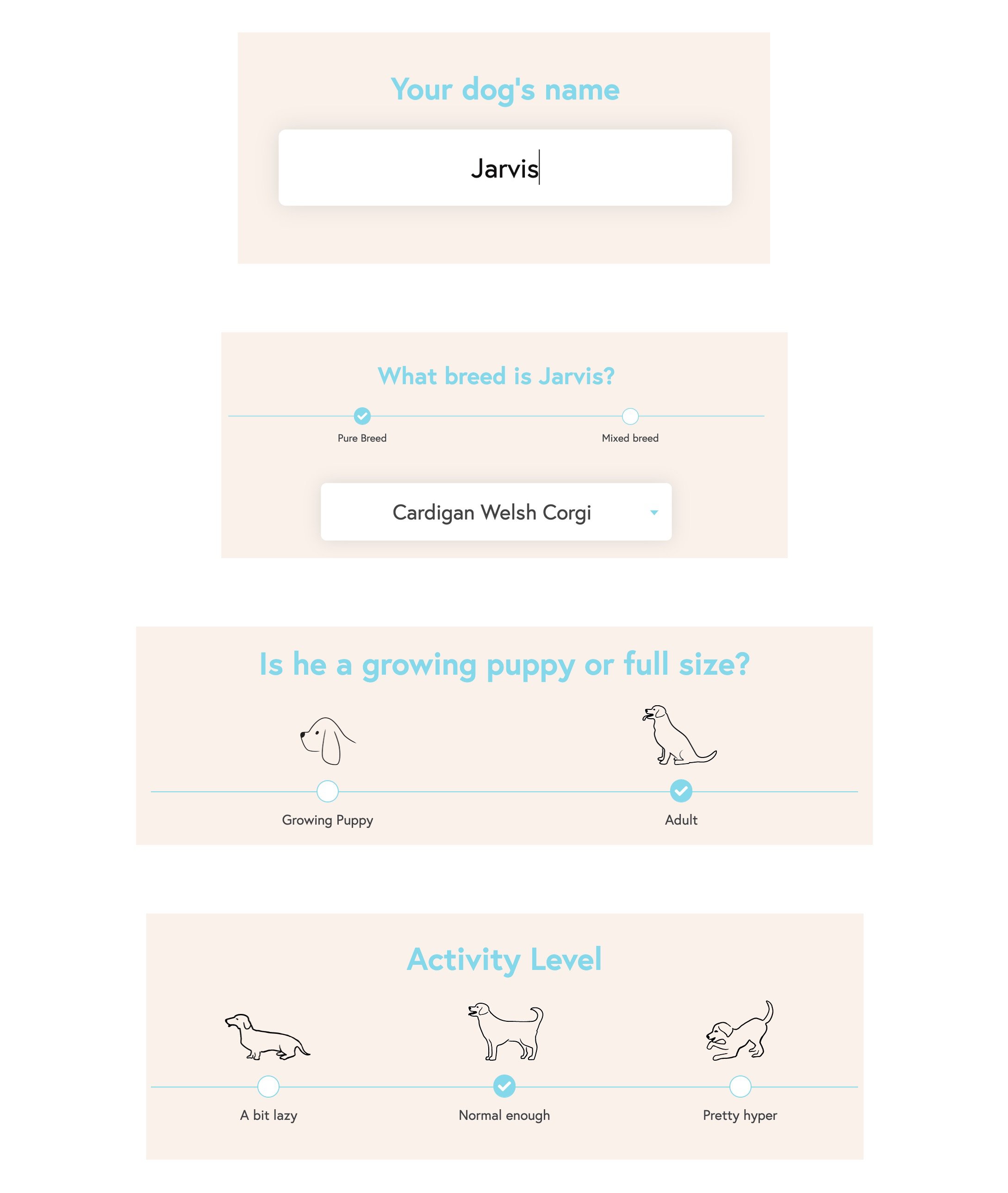 When a new customer lands on their website, they are asked a few questions about their dog: their name, sex, breed, age, weight and activity level. Based on their answers, a ‘box’ with the recommended renewal cycle for their dog is automatically added into the cart. The attention to detail is out of this world, and the experience is so seamless that it would even get dog owners themselves barking out of excitement.